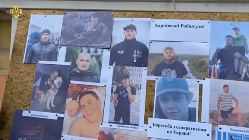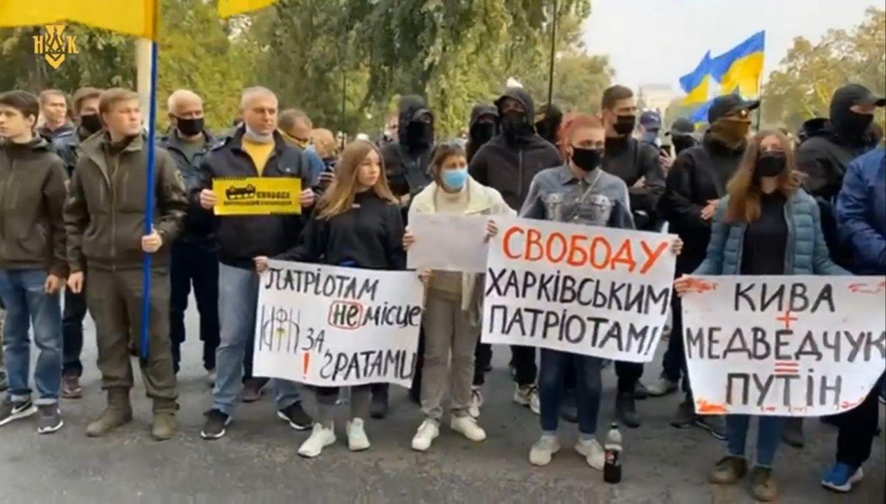 Под судом собрались сторонники подозреваемых и представители "Нацкорпуса". Они развернули большой баннер с перевёрнутым автобусом и надписью "Свободу харьковским патриотам".