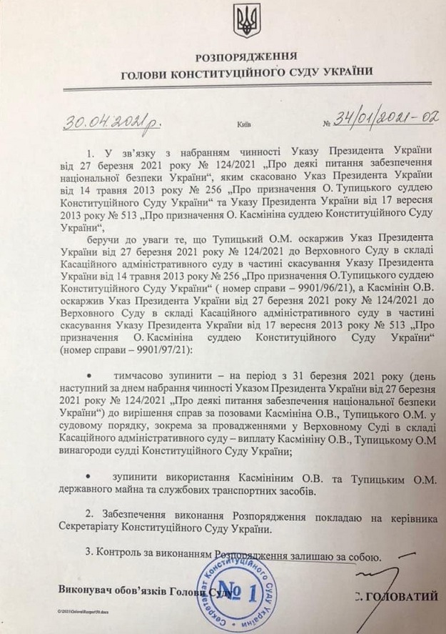 Воспользовавшись временным отсутствием Тупицкого (который на больничном), и. о. председателя КС Сергей Головатый сегодня издал распоряжение о приостановлении выплаты зарплаты А. Тупицкому и А. Касминину, и запретил использовать служебный транспорт. При этом как на правовое основание он сослался лишь на указ президента, а не на Конституцию и закон о КС, - сообщает издание.