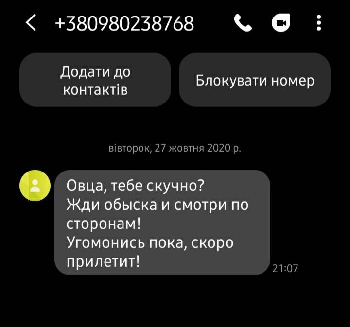 Впоследствии, после выхода материала, журналистка сообщила, что получила СМС с угрозами. "Овца, тебе скучно? Жди обыска и смотри по сторонам! Угомонись пока, скоро прилетит!", – такое сообщение получила журналистка.