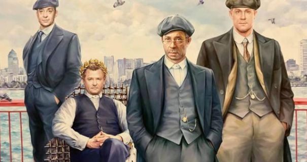 На свой день рождения Геннадий Корбан получил трехметровую картину с ироничным смыслом. Изображенные на картине люди напоминают персонажей бандитской криминальной драмы "Острые кепки"