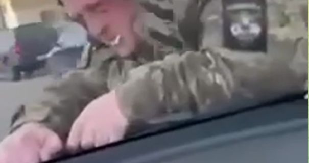 На видео видно, как мужчина в военной форме лежит на капоте авто, держась за стеклоочистители и что-то выкрикиваю в сторону водителя транспортного средства.