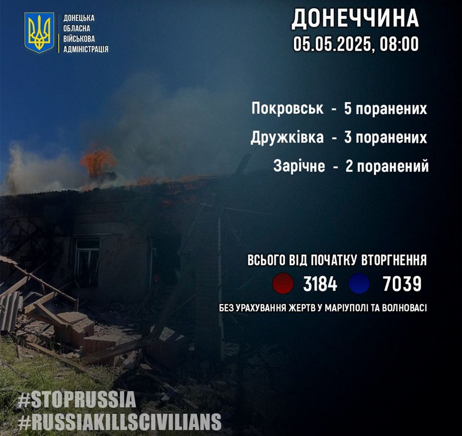"За 4 мая россияне ранили 10 жителей Донецкой области: 5 в Покровске, 3 в Дружковке и 2 в Заречном", — говорится в сообщении.