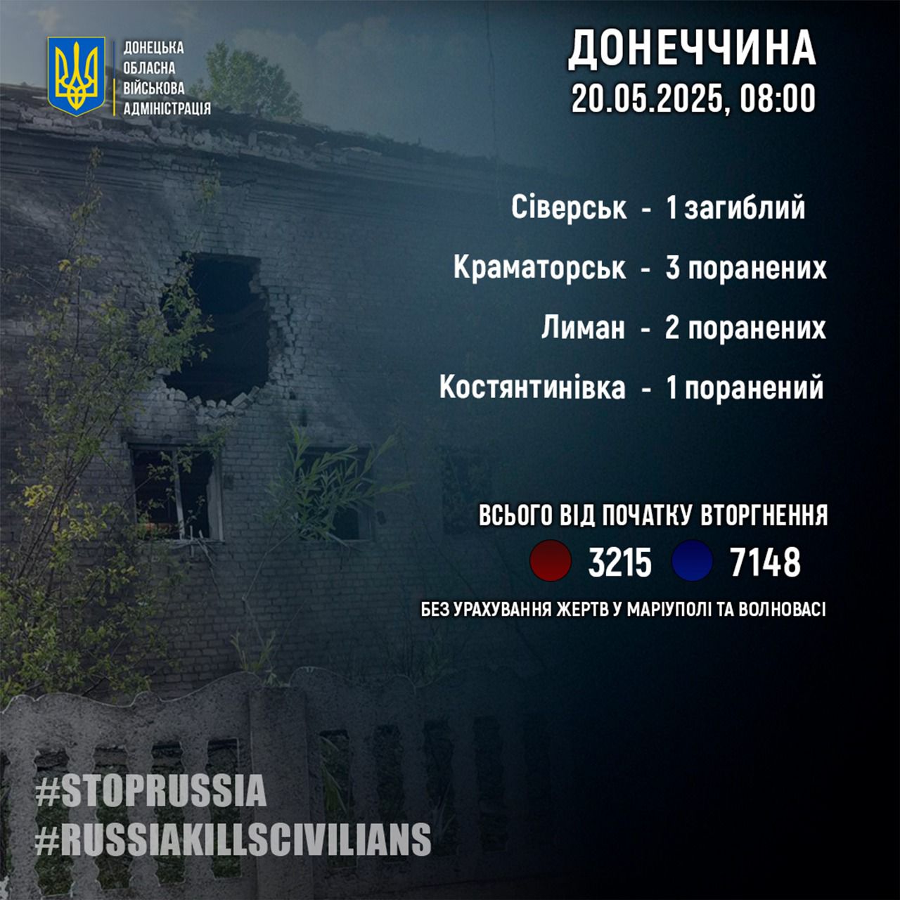 Общее количество жертв россиян в Донецкой области (3215 погибших и 7148 пострадавших) подано без учета Мариуполя и Волновахи.