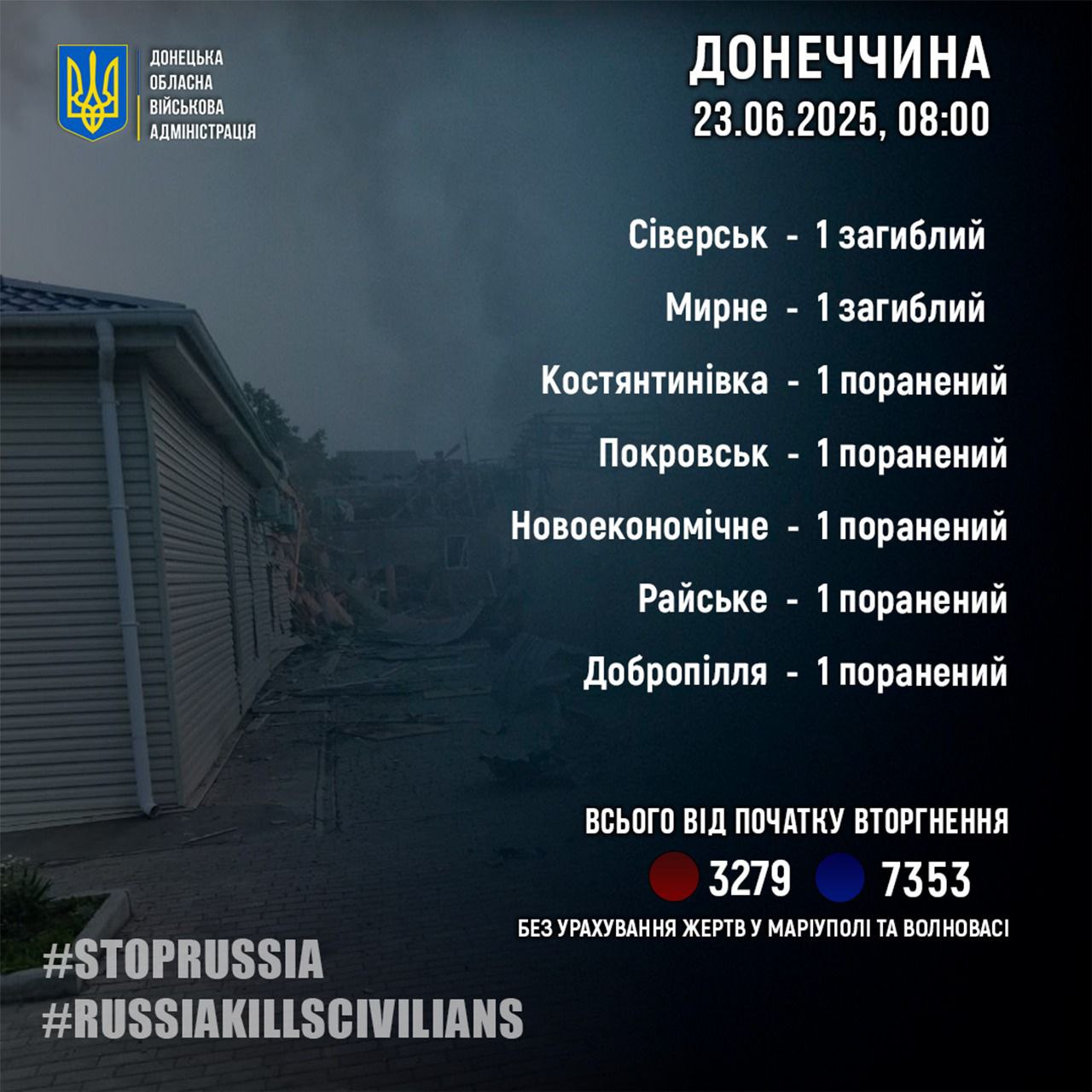 По оперативным данным, вчера россияне убили людей в Северске и Мирном. Из-за вражеских обстрелов гражданские получили ранения — в Константиновке, Покровске, Новоэкономическом, Райском и Доброполье.