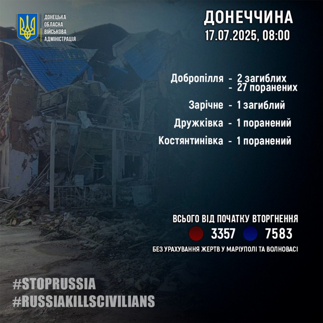 За прошедшие сутки, 16 июля, российские военные нанесли удары по Донецкой области, в результате чего погибли трое мирных жителей, а 29 человек получили ранения