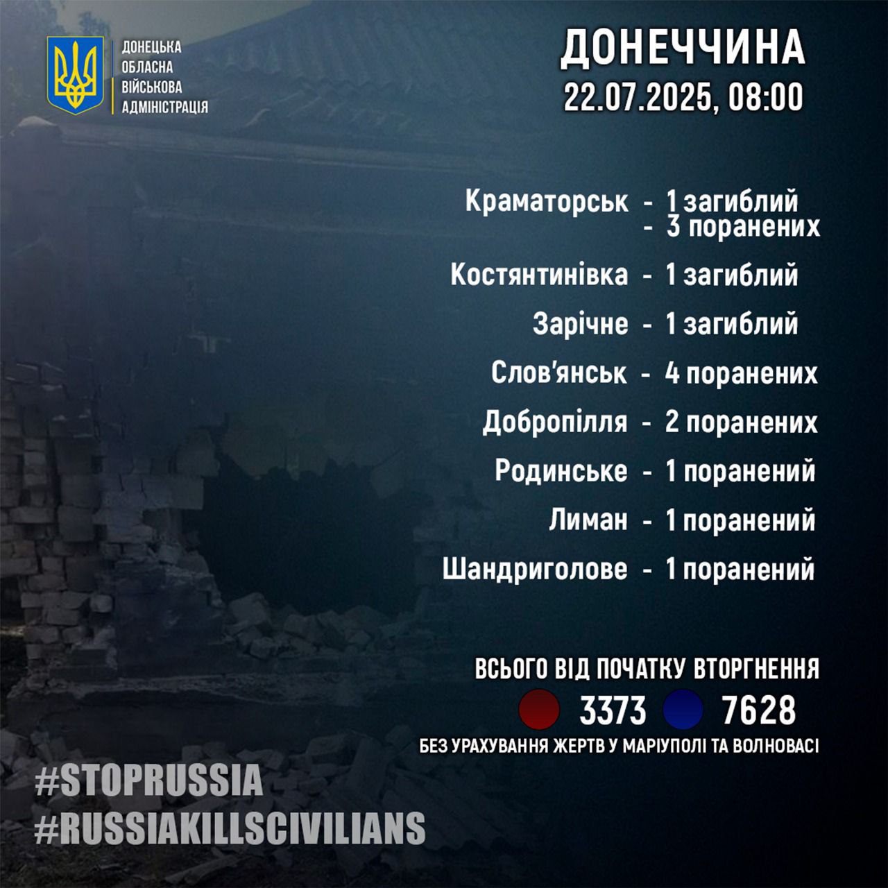 Общее число жертв РФ в Донецкой области (3 373 погибших и 7 628 пострадавших) зафиксировано без учета Мариуполя и Волновахи.