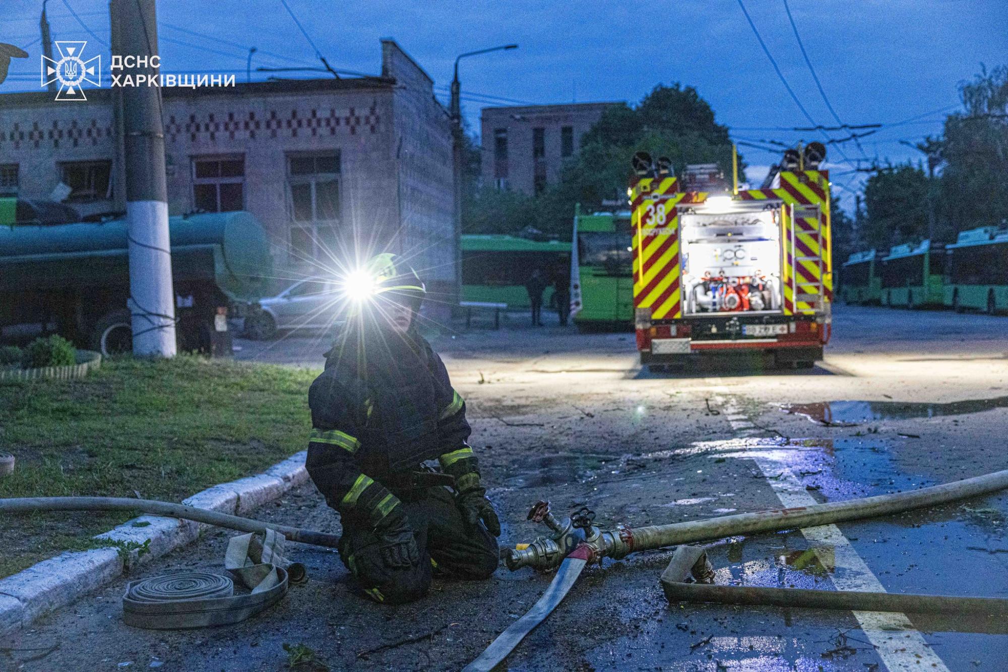 Спасатели потушили пожар, который произошел из-за вражеской атаки дронов по троллейбусному депо в Слободском районе Харькова