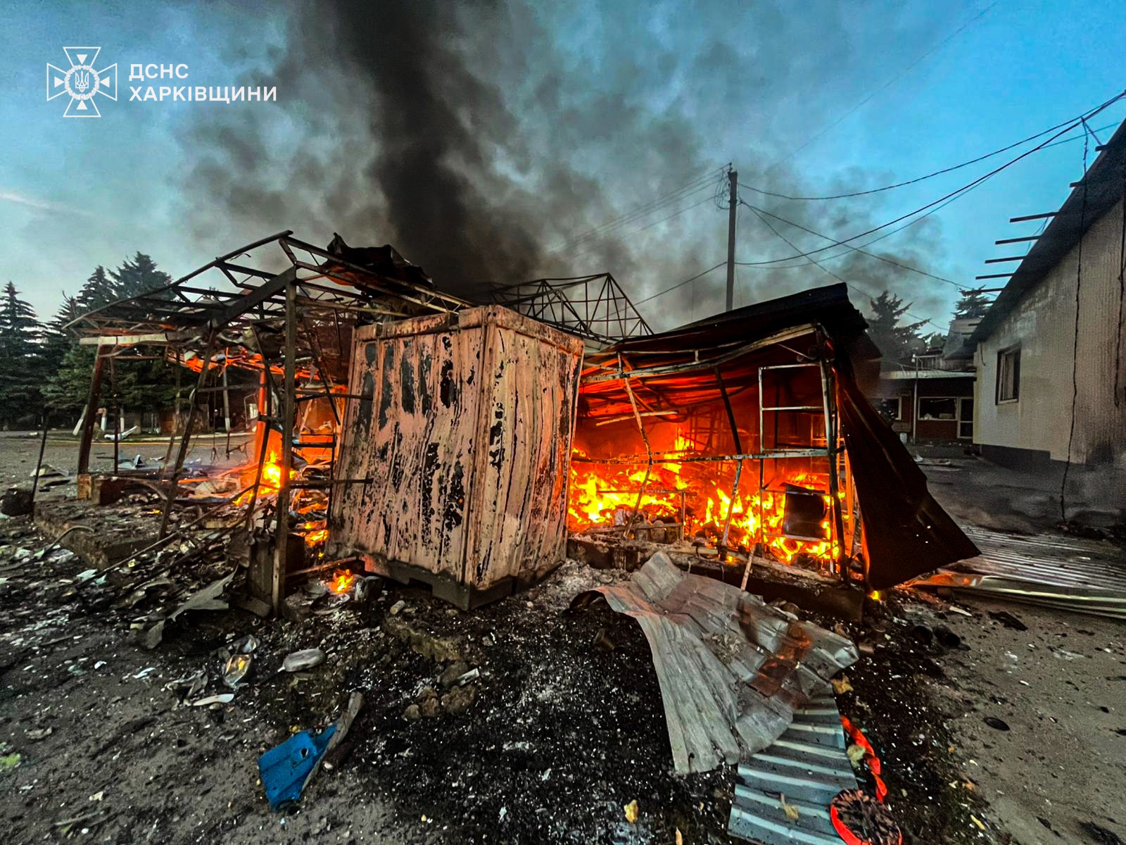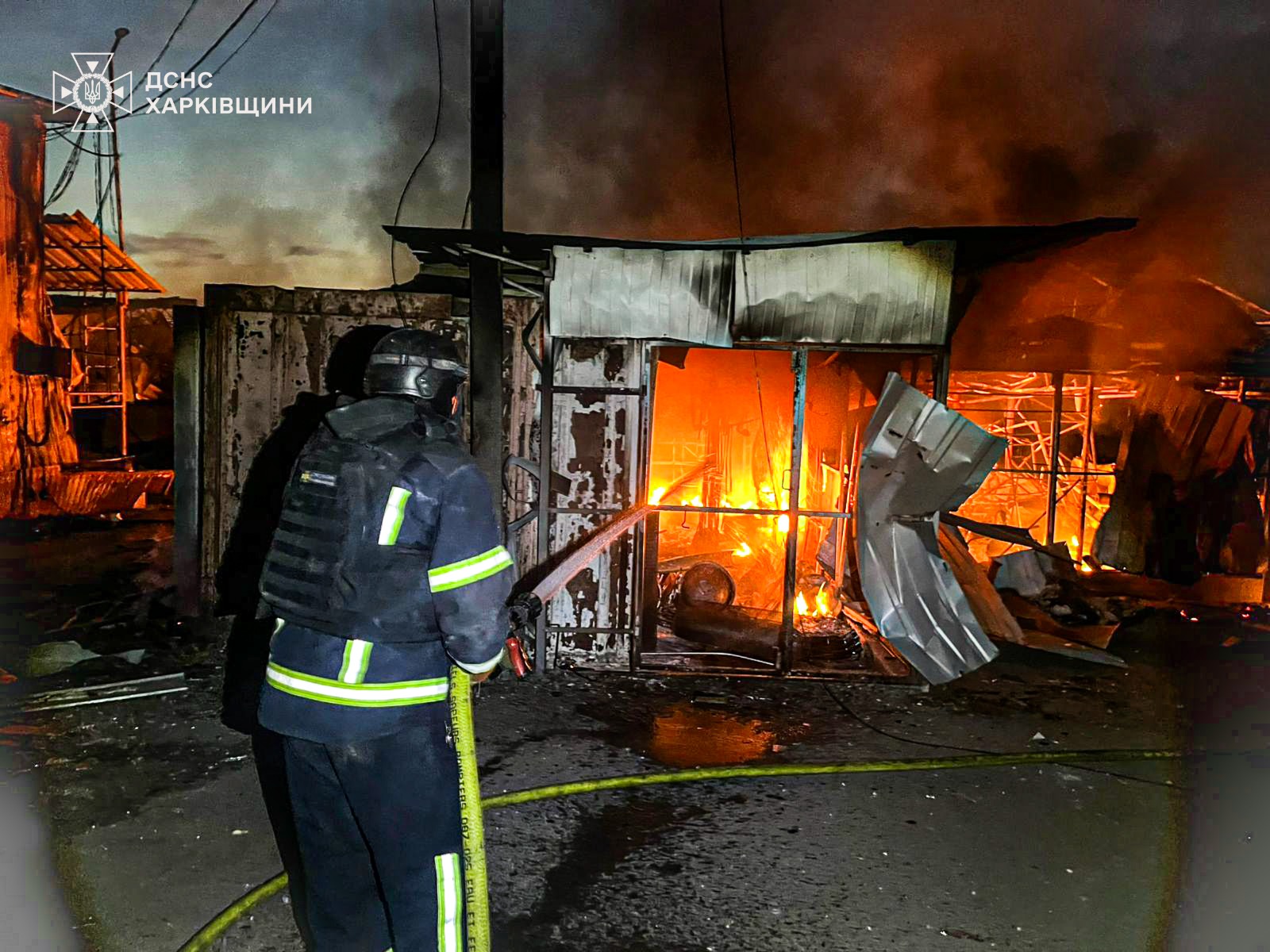Отмечается, что в результате попаданий возник пожар торговых павильонов площадью около 500 кв. м., которую быстро ликвидировали пожарные.