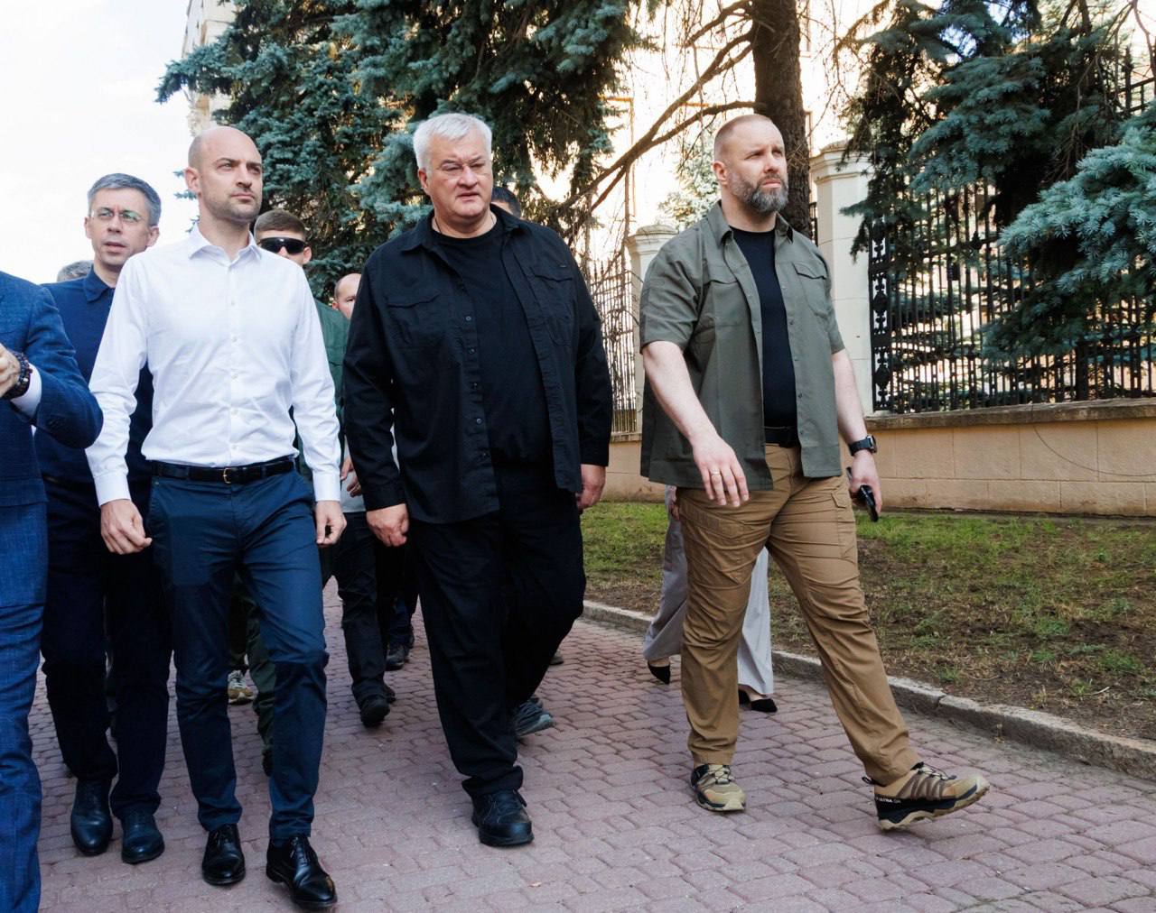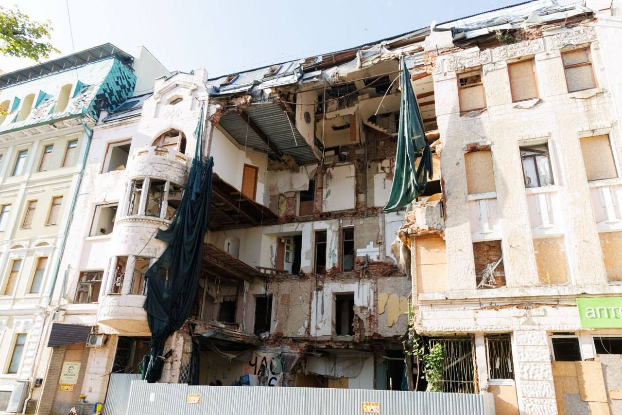 Французская делегация посетила исторический центр Харькова, в том числе здание Харьковской областной военной администрации, разрушенное в результате российского ракетного удара 1 марта 2022 года, в результате которого погибли 44 человека.
