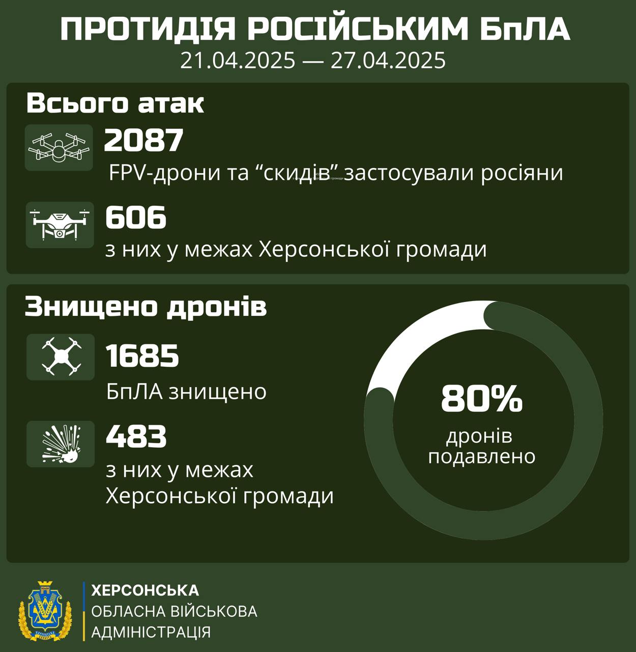 Россияне продолжают терроризировать Херсонщину дронами. За прошедшую неделю враг совершил почти 2100 ударов с помощью беспилотных летательных аппаратов