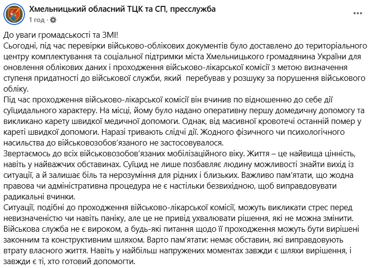 Трагедия произошла сегодня, 13 февраля, в здании Хмельницкого областного территориального центра комплектования и социальной поддержки (ТЦК и СП)