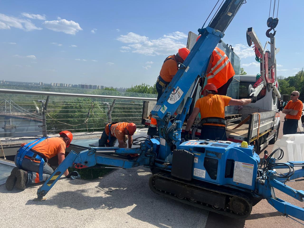 В Киеве на пешеходно-велосипедном мосту заменили поврежденное стекло
