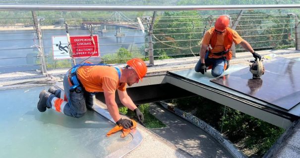 Специалисты коммунального предприятия «Киевавтодоргород» завершили работы по замене поврежденного стекла на пешеходно-велосипедном мосту, соединяющем Владимирскую горку с Аркой Свободы украинского народа