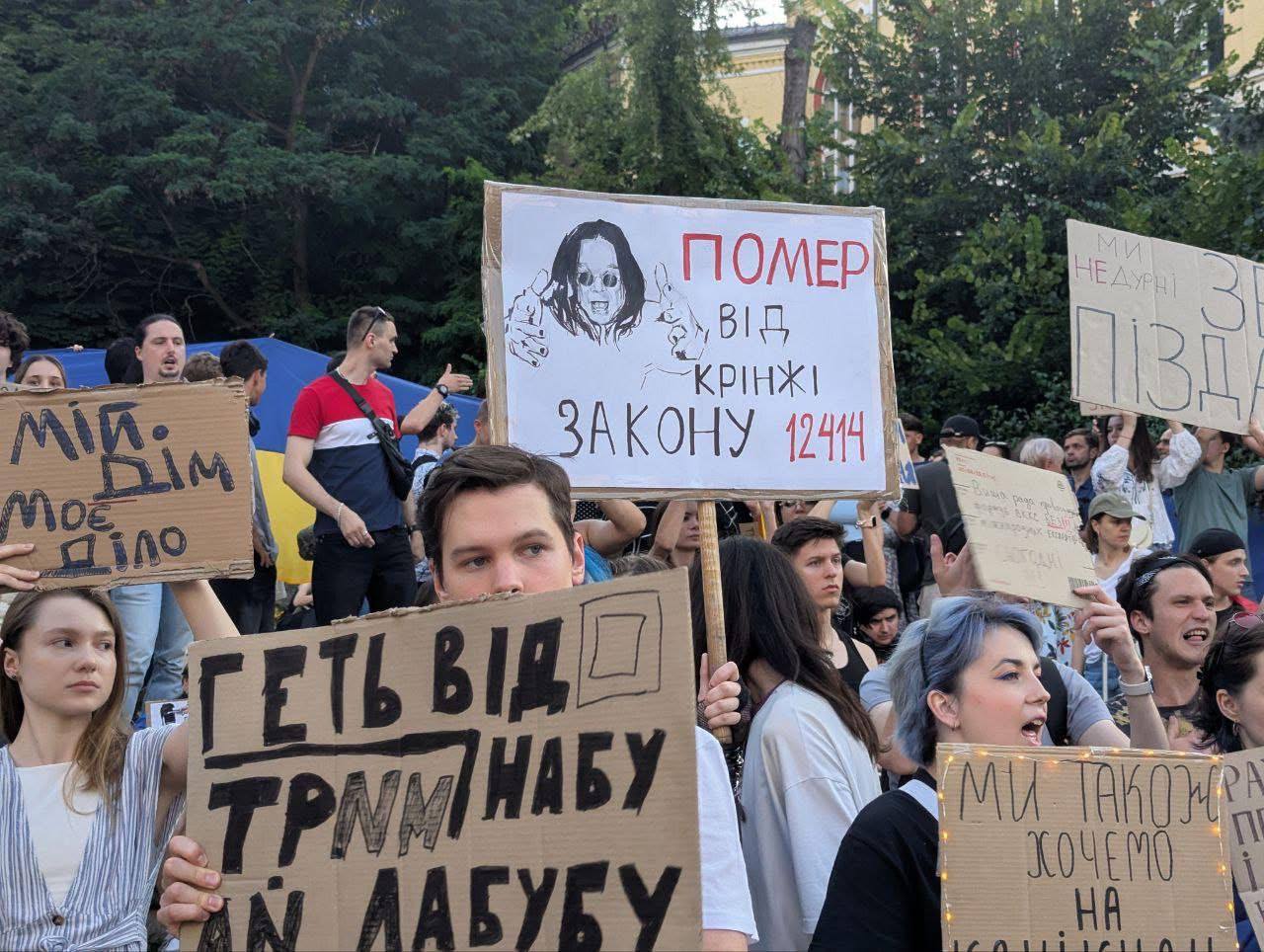 На фото можно увидеть, что люди пришли с плакатами. В частности, можно увидеть надписи: "Я воевала не за такую страну", "Руки прочь от НАБУ", "Мой дом — мое дело". Также можно заметить плакат: "Мы тоже хотим на каникулы". Последнее явный референс на то, что депутаты Верховной Рады после принятия скандального закона ушли на каникулы до конца августа.