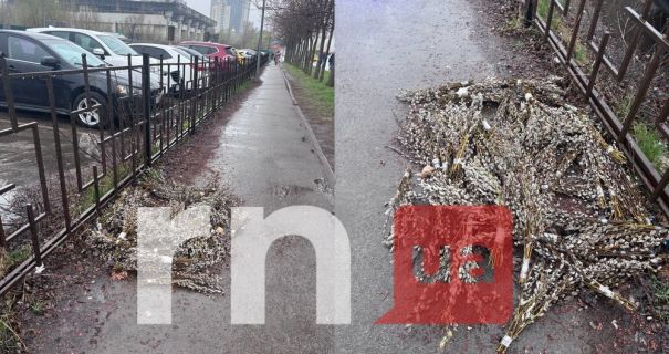 Как отмечает корреспондент издания, в воскресенье букеты вербы в Киеве продавали от 100 грн, а уже на следующий день остатки массово выбросили возле метро Ипподром.