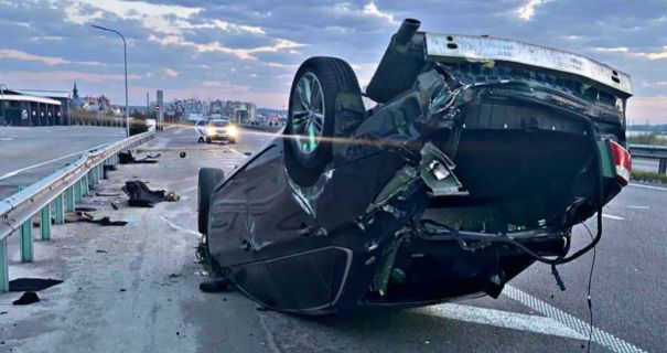 Водитель авто Toyota не справился с управлением и въехал в отбойник. От удара легковушка перевернулась на крышу.