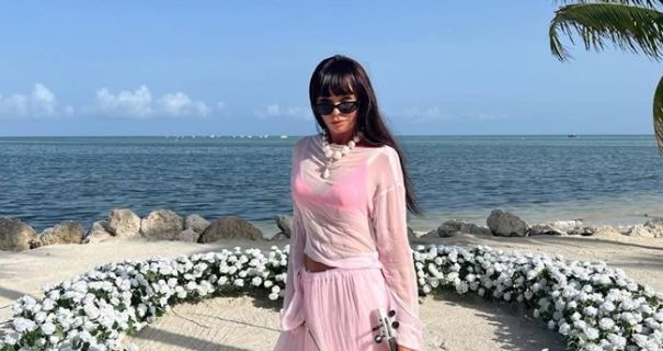 Артистка позирует в нежных розовых одеждах на фоне моря, намекая на свадебную тематику.