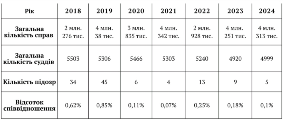 Также в материале "Трансформация судебной системы" приведена таблица процентного соотношения количества судей к количеству подозрений.