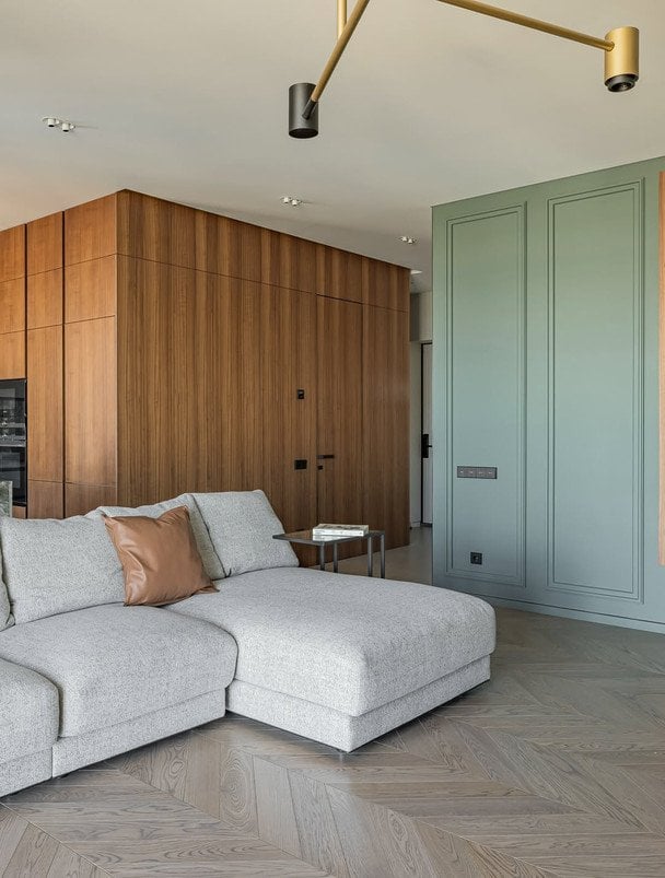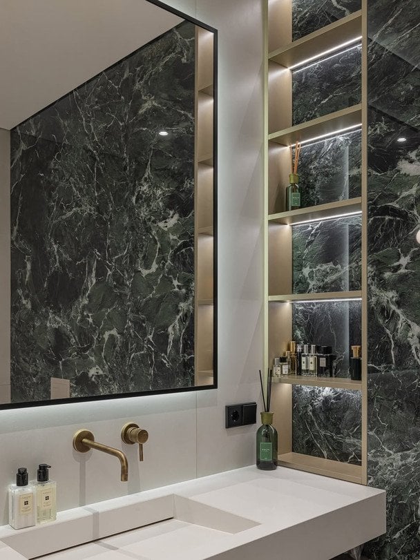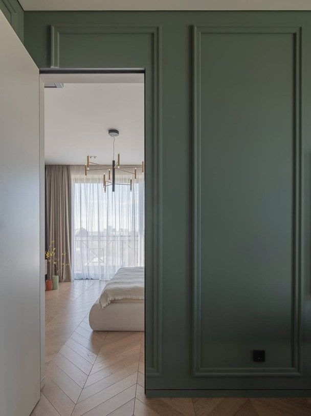 В апартаментах все оформлено в темно-зеленых оттенках, но со светлым деревом и мраморными вставками. Также можно увидеть светлую спальную комнату с панорамным окном. Серый мрамор есть в каждой комнате.