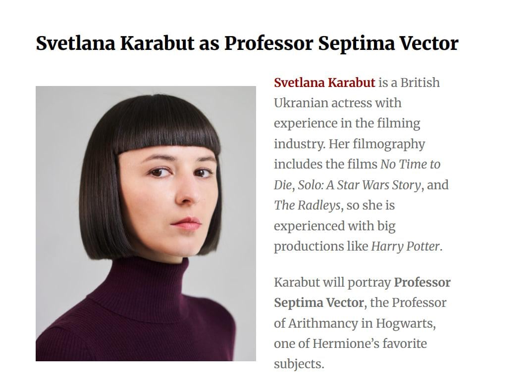 Стало известно, что Септиму Вектор в новом сериале о Гарри Поттере сыграет украинская актриса и модель Светлана Карабут. Стоит напомнить, что вектор – это любимая преподавательница Гермионы. В фильмах роль была эпизодическая.