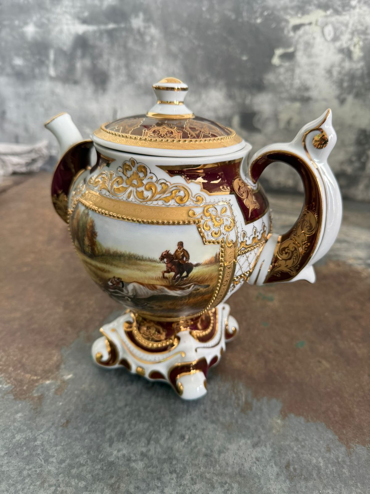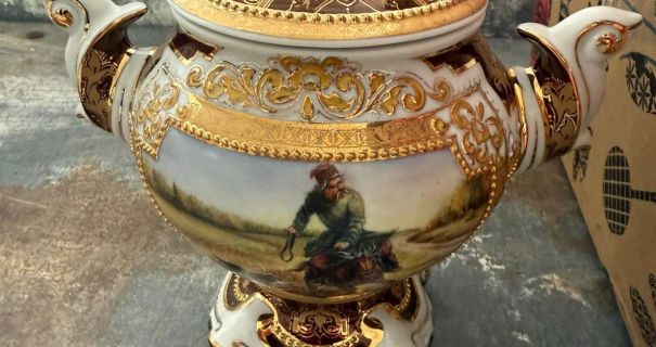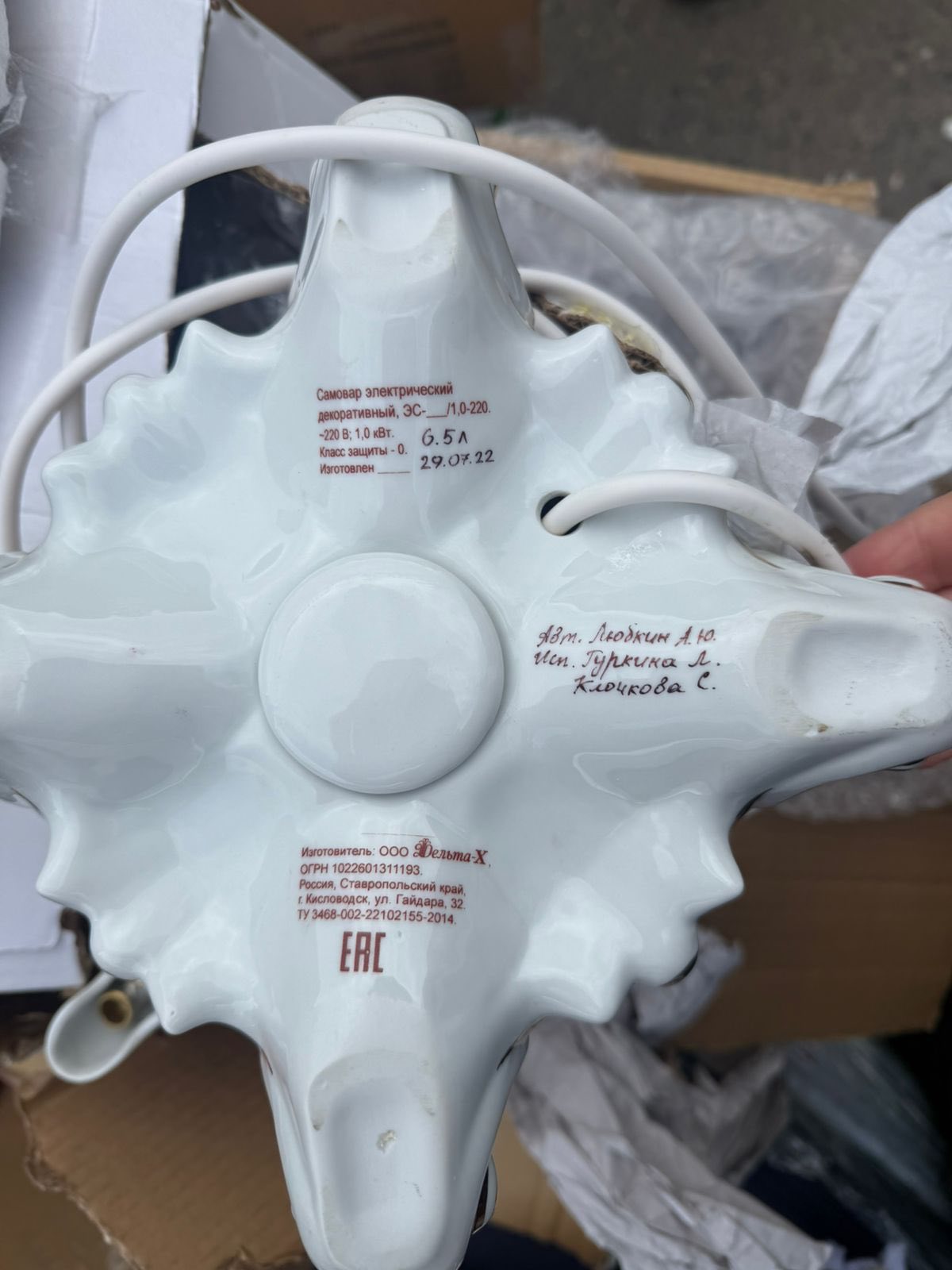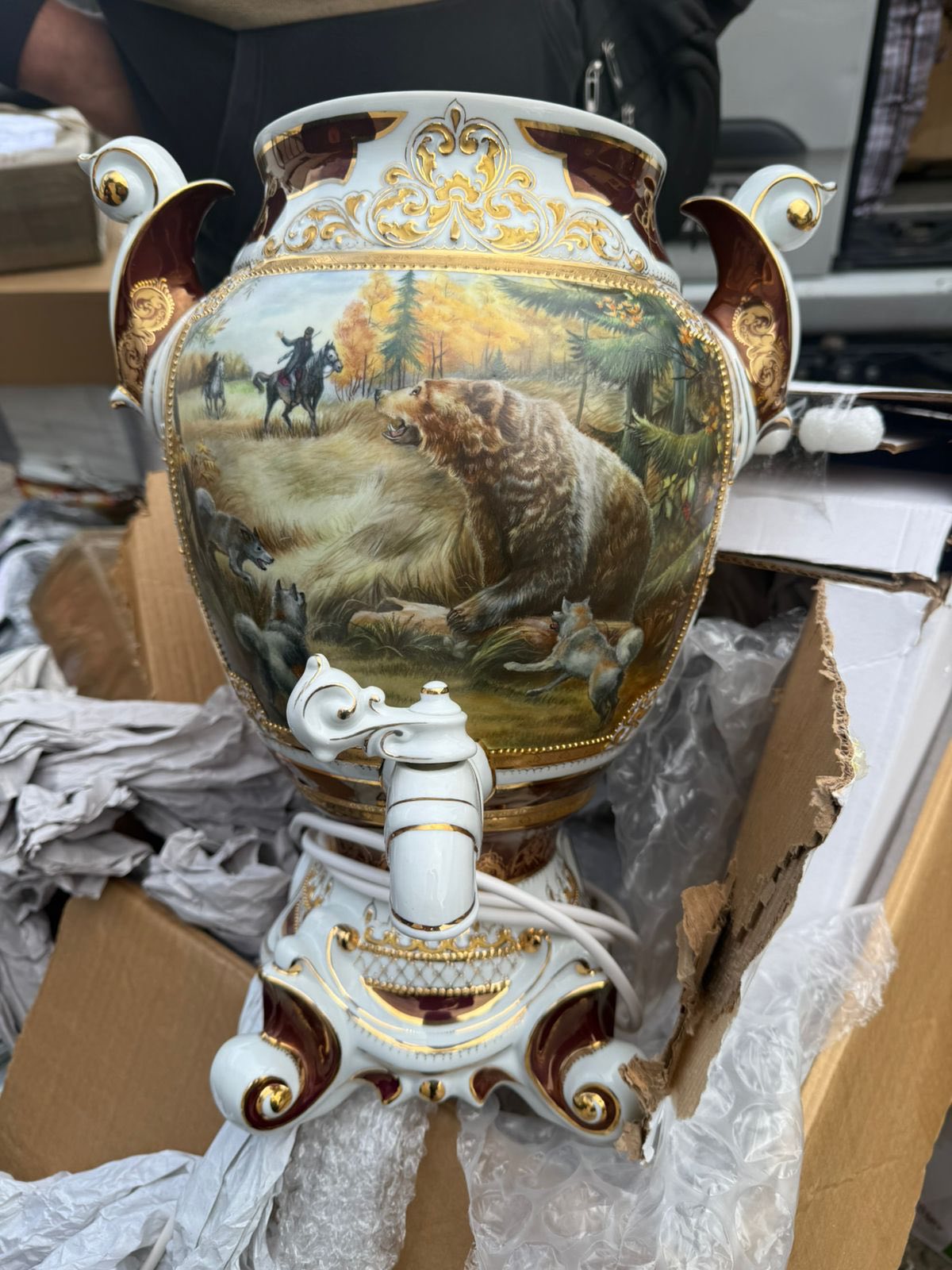 Среди них – самовар с изображением медведя, фарфоровый чайник, декоративную тарелку и конфетку ручной работы, все – российского производства.