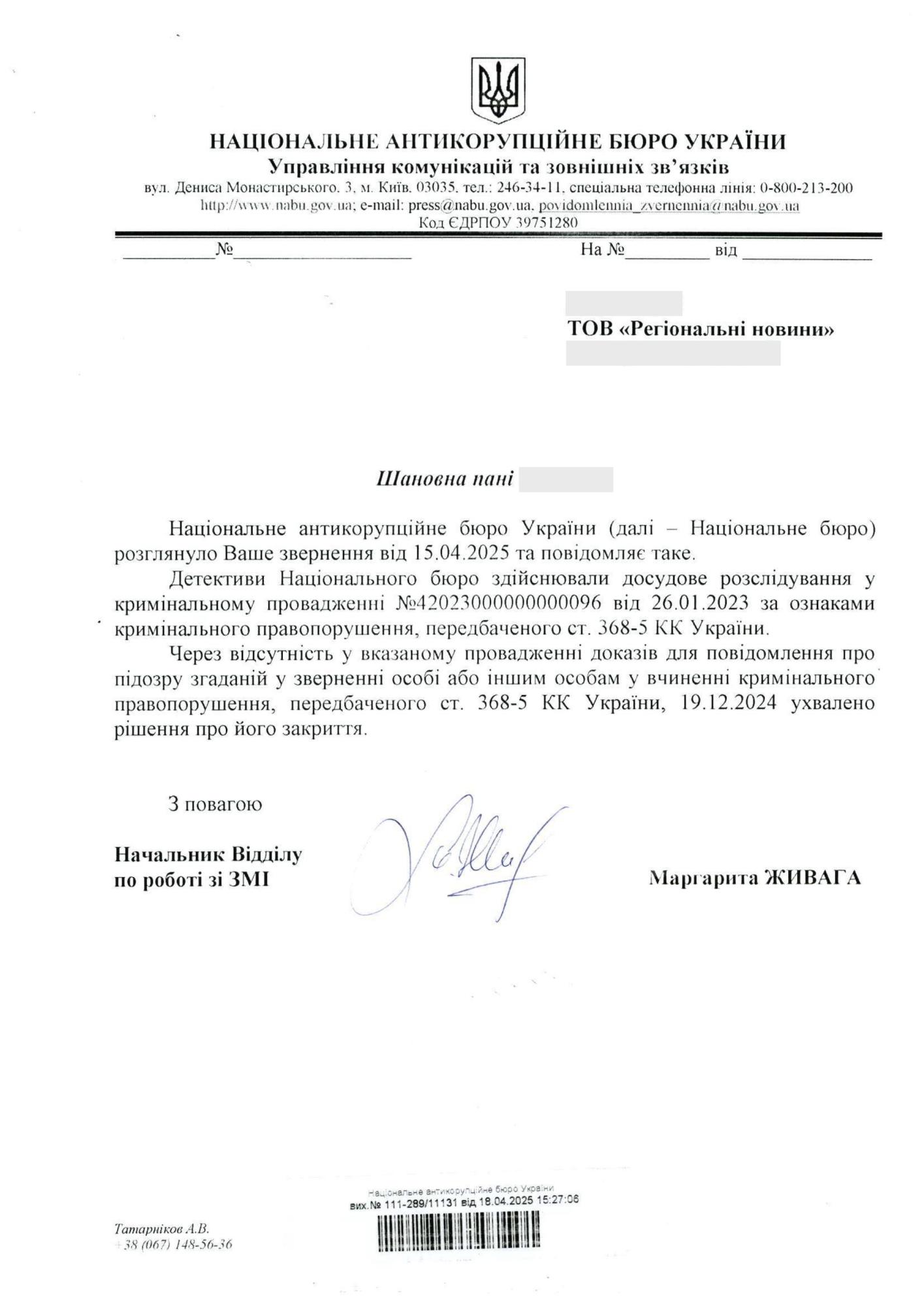 Однако, судя по ответу НАБУ, в ходе досудебного расследования, проводившегося в 2023-2024 годах, детективы не нашли подтверждения этой информации и закрыли уголовное производство.