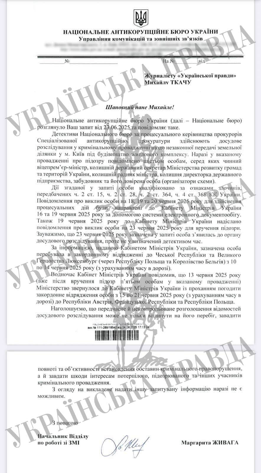 "В то же время Кабинет Министров Украины сообщил, что 13 июня 2025 года (уже после вручения подозрений пяти лицам в указанном производстве) Министерство обратилось в Кабинет Министров Украины с просьбой согласовать заграничную командировку лица с 15 по 21 июня 2025 года (с учетом времени в дороге) в Республику Австрию" в НАБУ.