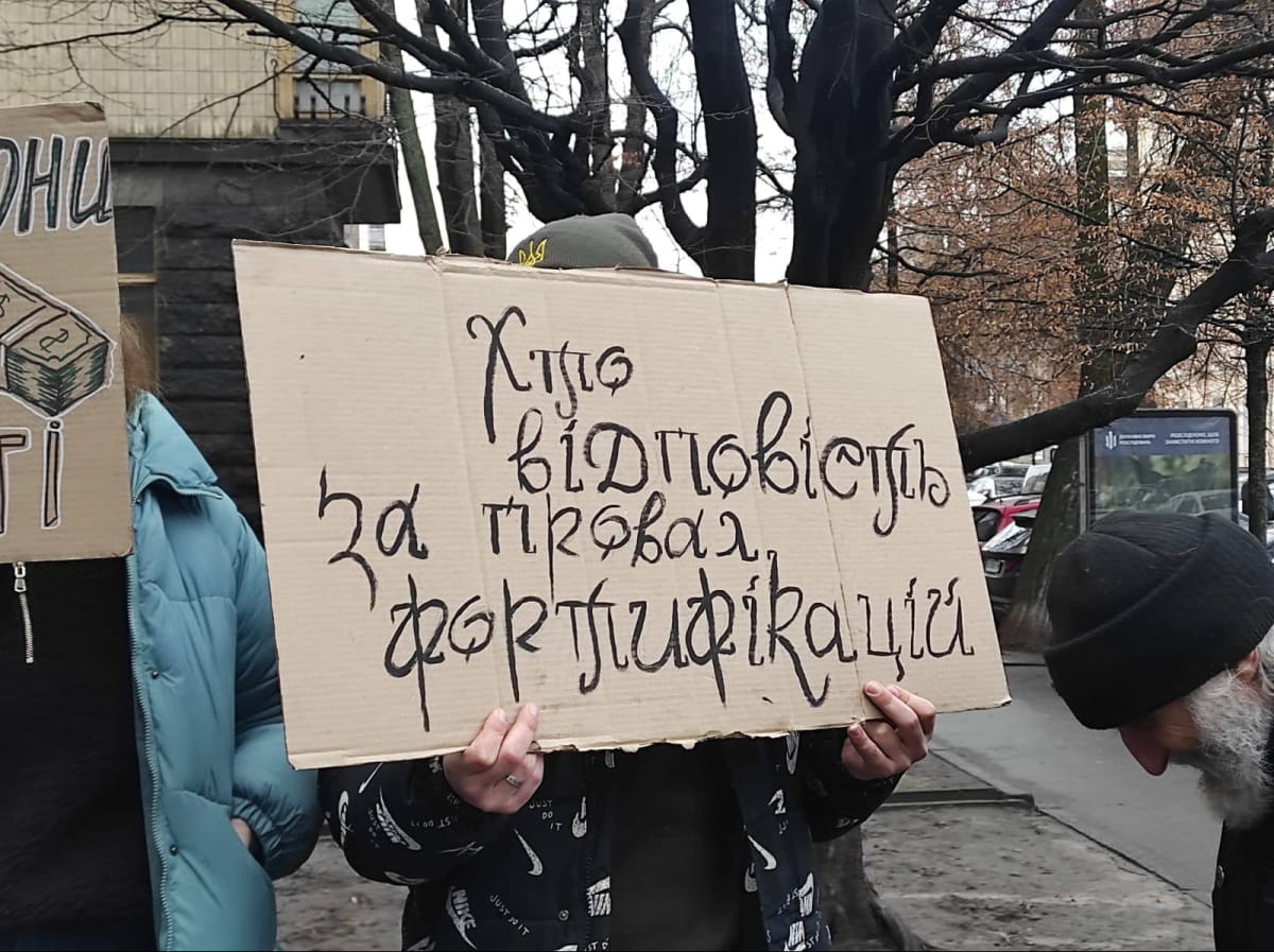 Участники держат плакаты с надписями: "Пронин, кто украл 200 млн на фортификациях?", "Почему мои братья в недостроенных окопах?", "Пронин продает санкции СНБО", "Пронин за Ермаком".