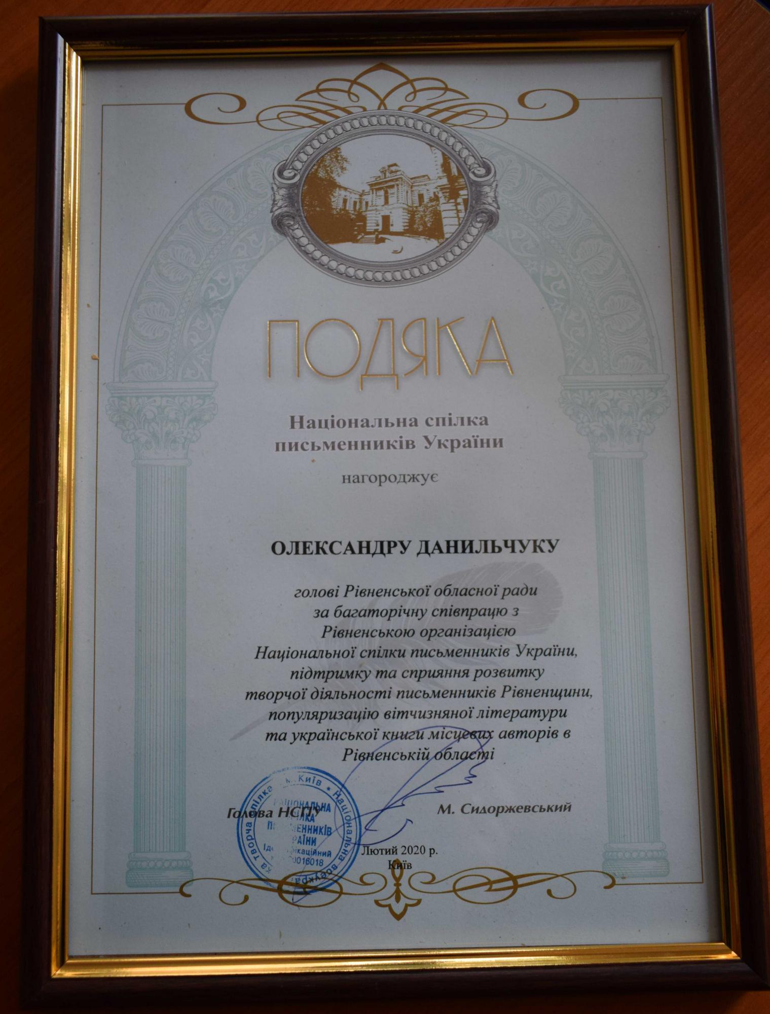 Председателя Ровенского облсовета наградили грамотой местные писатели
