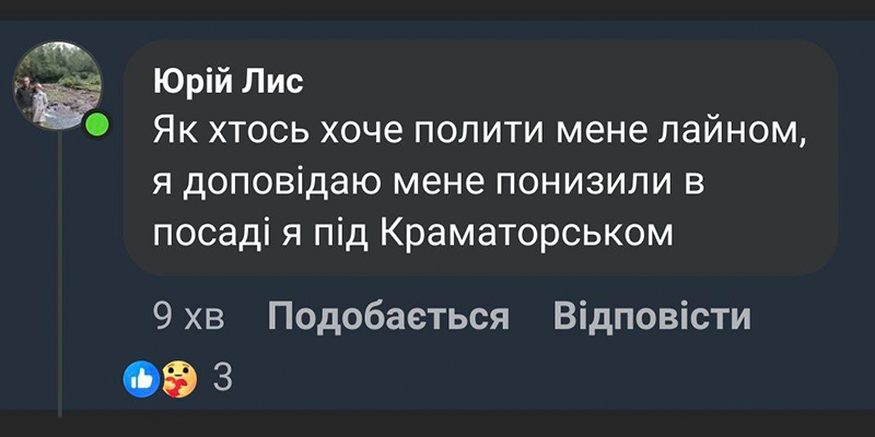 19 апреля у себя на странице в фейсбуке подполковник написал: "Как кто-то хочет полить меня дерьмом, я докладываю меня снизили в должности, я под Каматорском".