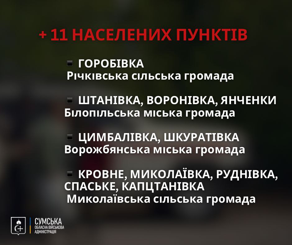 В Сумской области была расширена обязательная эвакуация еще на 11 населенных пунктов. Речь идет о прифронтовых общинах, находящихся под постоянными обстрелами РФ