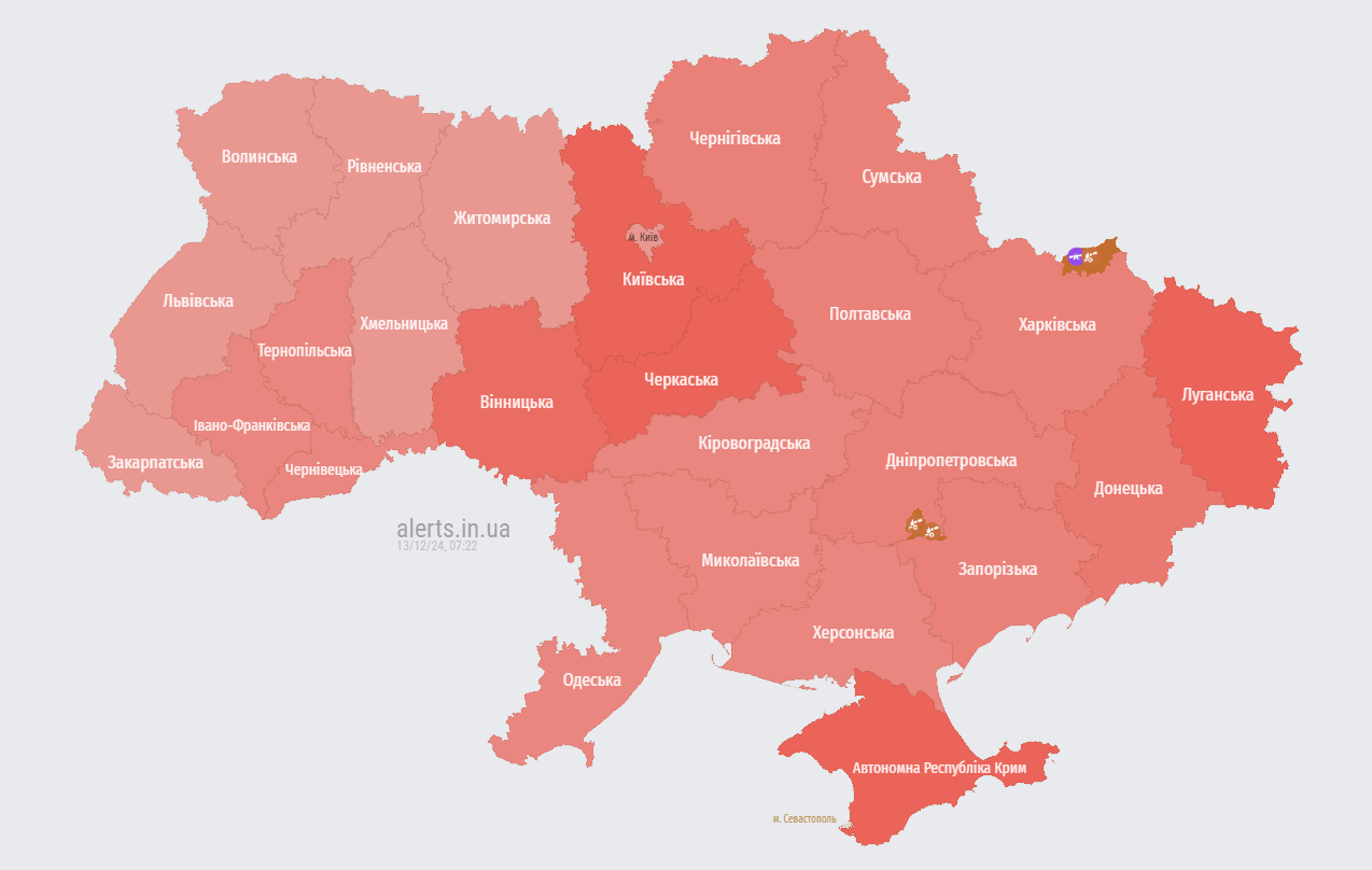 Утром, 13 декабря, по всей Украине объявлена воздушная тревога. В ряде областей опасность сохранялась на протяжении всей ночи