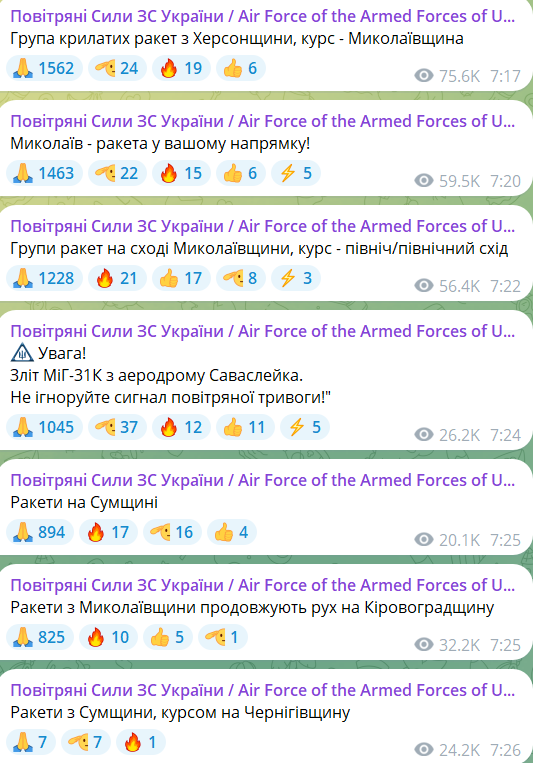 Также были пуски с самолетов ТУ-95мс. Фиксируется вхождение в воздушное пространство ракет со стороны Сумской области.