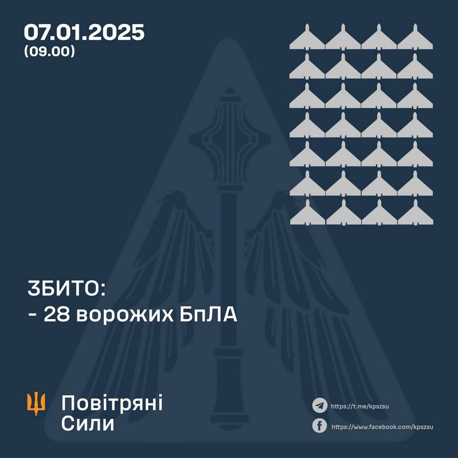 В ночь на 7 января армия РФ выпустила по Украине около 40 беспилотников разных типов. Силы ПВО сбили 28 вражеских дронов, еще 10 — локационно потеряны