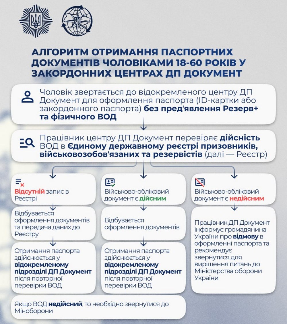 Для получения паспортных документов за границей мужчинам 18-60 лет необходимо обратиться в обособленный центр ГП "Документ". Физически предъявлять военно-учетный документ или Резерв+ гражданам не требуется. Из-за недействительных ВУД в оформлении паспорта откажут