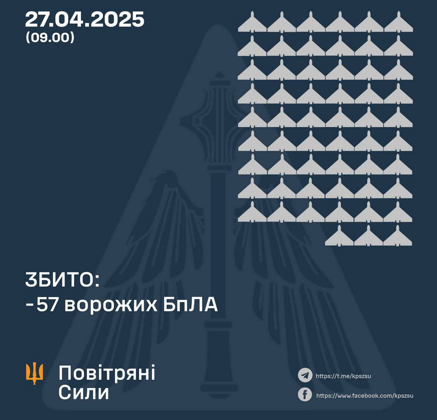 В ночь на 27 апреля российская армия запустила по Украине 149 ударных БПЛА типа "Shahed" и беспилотников-имитаторов разных типов. Силы ПВО сбили 57 вражеских дронов, еще 67 — локационно потеряны