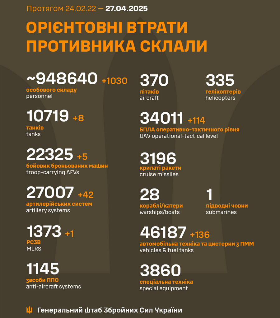 За прошедшие сутки, 26 апреля, Силы обороны Украины уничтожили 1 030 российских захватчиков, одну систему РСЗО, восемь танков, пять боевых бронированных машин, 42 артсистемы, 114 БпЛА оперативно-тактического уровня и 136 единиц автомобильной техники и автоцистерн