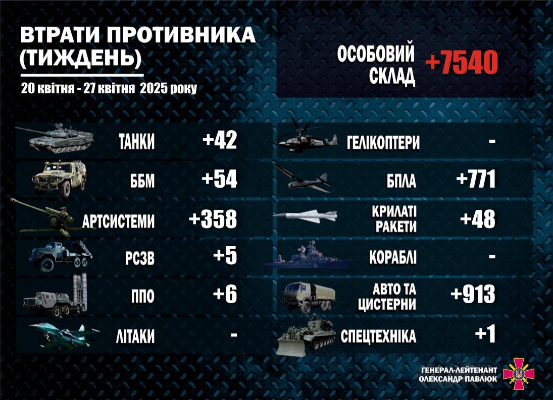 За прошедшую неделю, с 20 по 27 апреля, Силы обороны Украины уничтожили около 7 540 оккупантов, а также 2 198 единиц вооружения и военной техники российских захватчиков