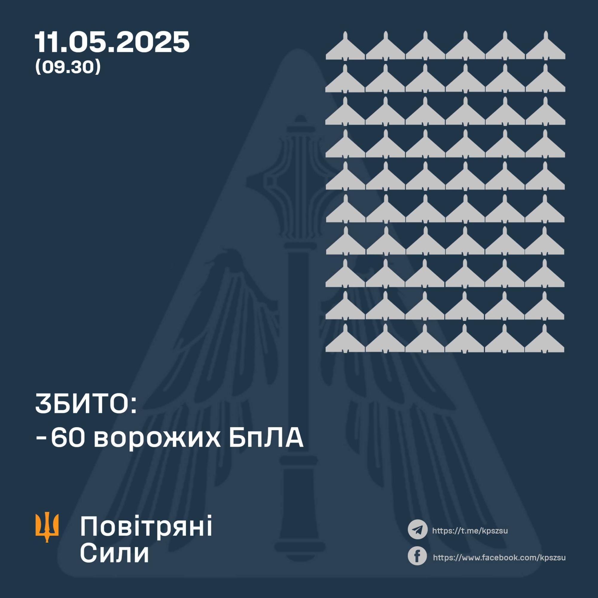 В ночь на 11 мая российская армия запустила по Украине 108 ударных БпЛА типа "Shahed" и беспилотников-имитаторов разных типов. Силы ПВО сбили 60 вражеских дронов, еще 41 — локационно потеряны