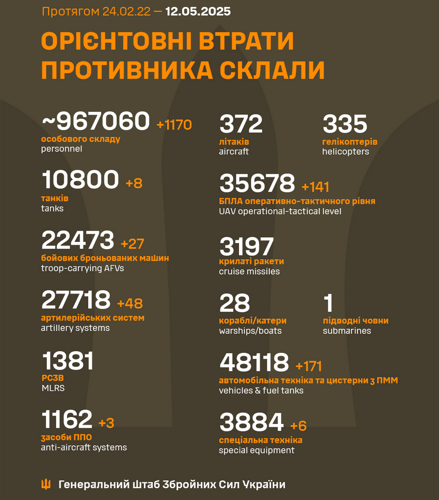 За прошедшие сутки, 11 мая, Силы обороны Украины уничтожили 1 170 российских захватчиков, восемь танков, 27 боевых бронированных машин, три средства ПВО, 48 артсистем, 141 БпЛА оперативно-тактического уровня и 171 единицу автомобильной техники и автоцистерн
