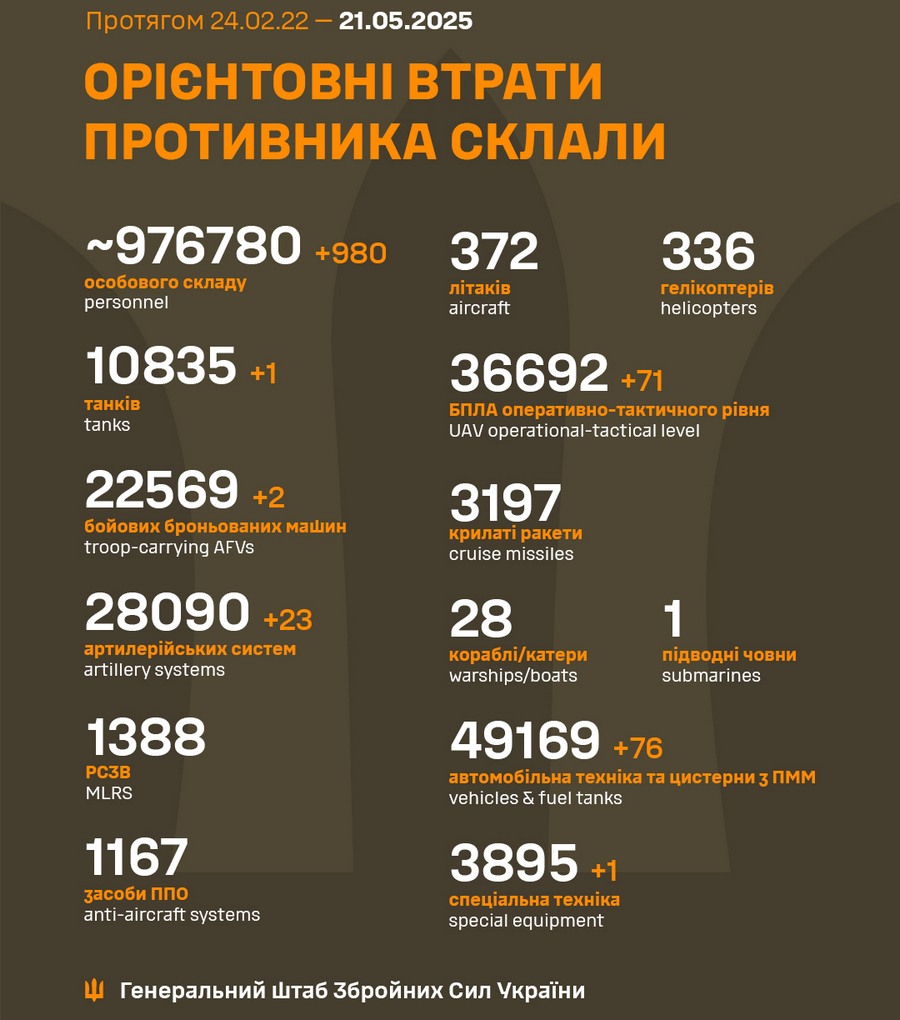 За прошедшие сутки, 20 мая, Силы обороны Украины уничтожили 980 российских захватчиков, танк, две ББМ, 23 артсистемы, 71 БпЛА оперативно-тактического уровня и 76 единиц автомобильной техники и автоцистерн