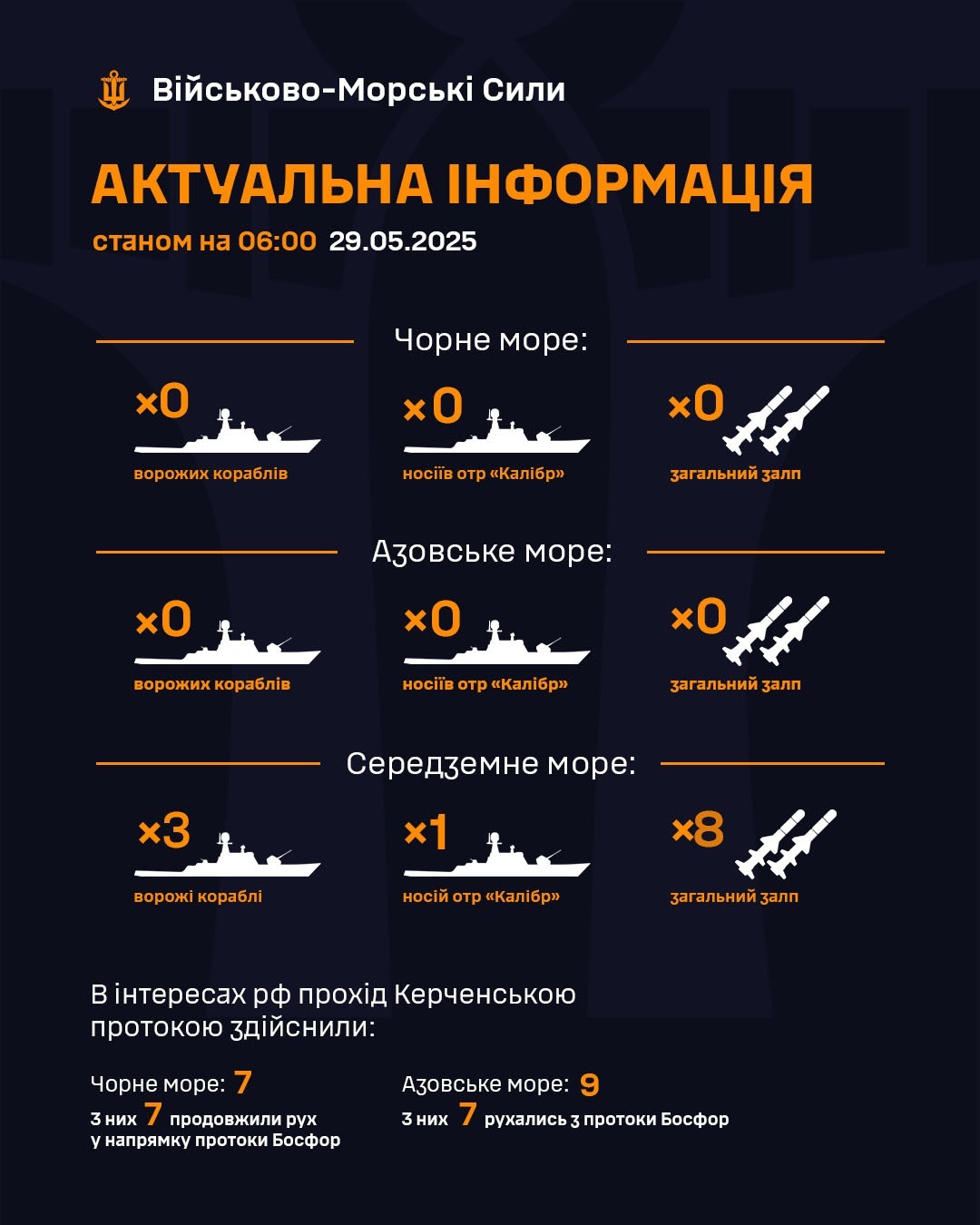 В четверг, 29 мая, в Черном и Азовском морях не зафиксированы российские корабли, способные нести крылатые ракеты "Калибр"