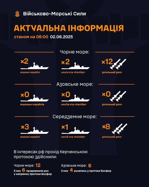 В понедельник утром, 2 июня, российская армия держит в акватории Черного моря два корабля, являющихся носителями крылатых ракет "Калибр". Общий залп – до 12 ракет