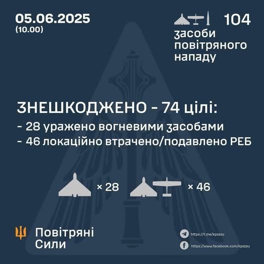 В ночь на 5 июня противник атаковал Украину 103 ударными БпЛА типа Shahed и беспилотниками-имитаторами разных типов, а также баллистической ракетой Искандер-М/KN-23.