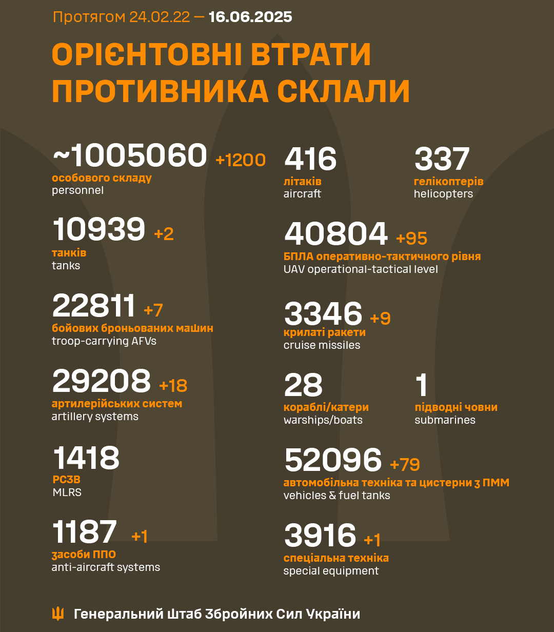 Генштаб ВСУ обновил данные о потерях врага: информация по состоянию на 16 июня