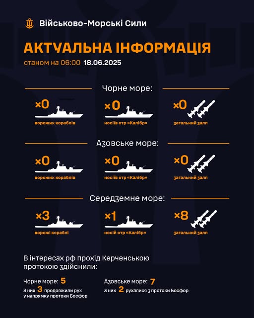 В среду утром, 18 июня, в Черном и Азовском морях не зафиксированы российские корабли, способные нести крылатые ракеты "Калибр"