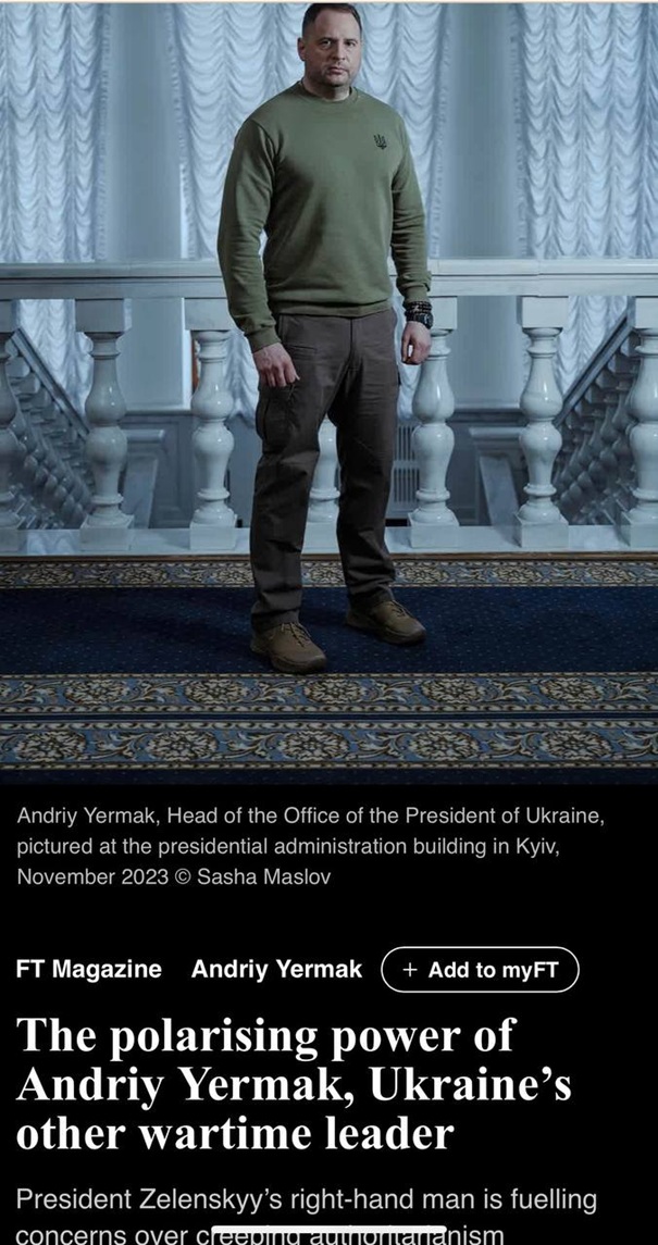 Автор материала называет его "другим лидером Украины во время войны", обращая внимание на беспрецедентную концентрацию полномочий в руках одного человека. Издание отмечает, что роль Ермака в системе власти стала настолько значимой, что вызывает беспокойство со стороны части западных дипломатов.
