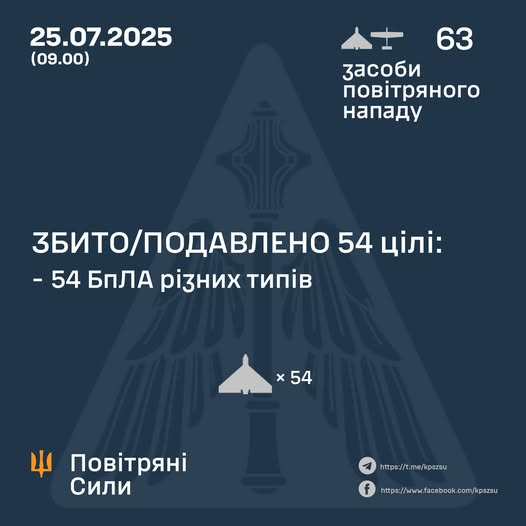 В ночь на 25 июля россияне атаковали Украину 63-мя средствами воздушного нападения: 2-мя баллистическими ракетами Искандер-М/KN-23 и 61-м ударным БпЛА типа Shahed и беспилотниками-имитаторами разных типов