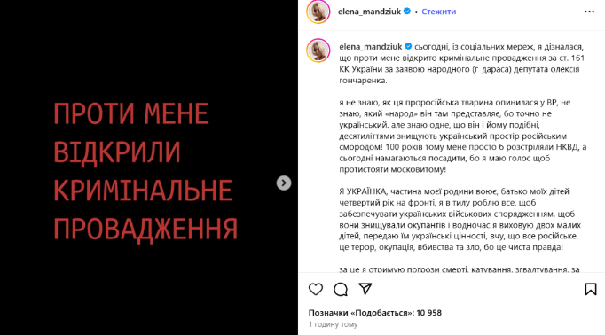 По словам Мандзюк, она узнала об открытом против нее уголовном деле по социальным сетям. В тот же день она опубликовала сообщение с резкой критикой народного депутата Украины Алексея Гончаренко, по заявлению которого было открыто производство.