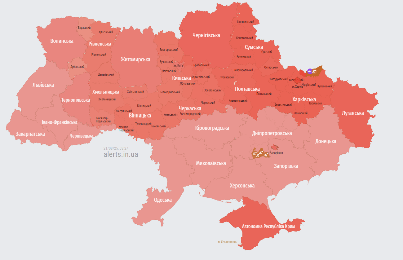 В ночь на 21 августа Россия совершила очередную массированную комбинированную атаку на Украину. Враг применил ударные дроны "Шахед", аэробалистические ракеты "Кинжал", а также крылатые ракеты "Калибр", запускавшиеся из акватории Черного моря и стратегической авиации. Воздушная тревога объявлялась в большинстве регионов страны